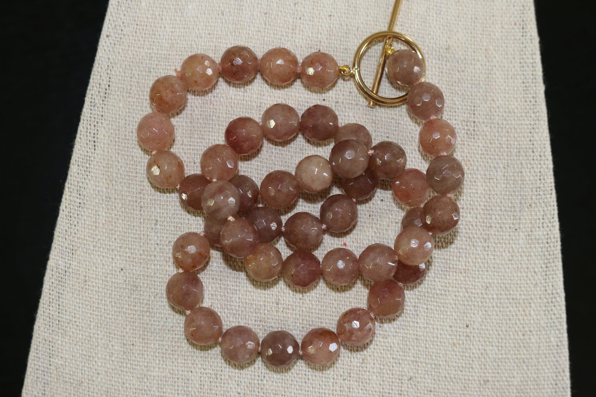 A strand of natural strawberry quartz beads in a perfect soft pink tone. Each bead is about 9 mm, hand-strung and knotted for strength and smooth drape. Finished with a gold-filled toggle clasp that complements the stone’s warmth and clarity.